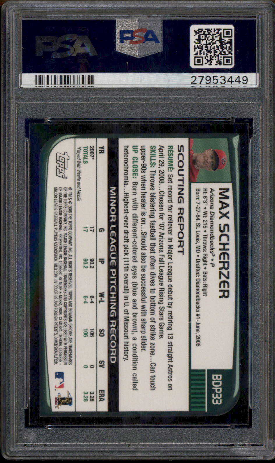 2008 Bowman Draft Picks & Prospects Chrome #BDP33 Max Scherzer RC PSA 10