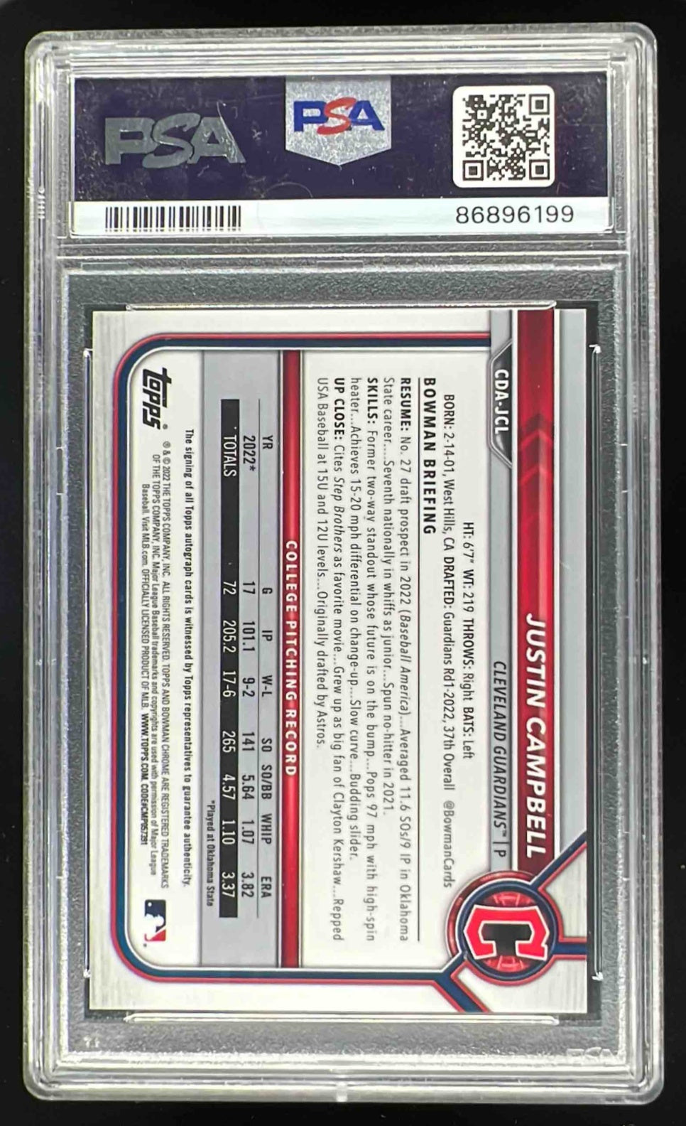 2022 Bowman Draft Chrome Pick Sparkle #CDAJCL Justin Campbell RC Auto /71 PSA 10