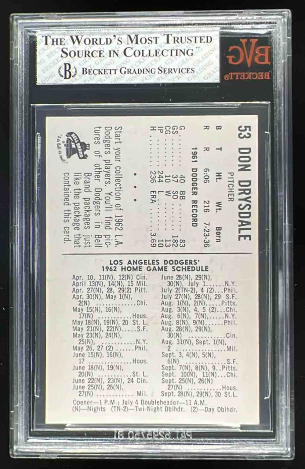 1962 Dodgers Bell Brand #53 Don Drysdale BGS 7.5