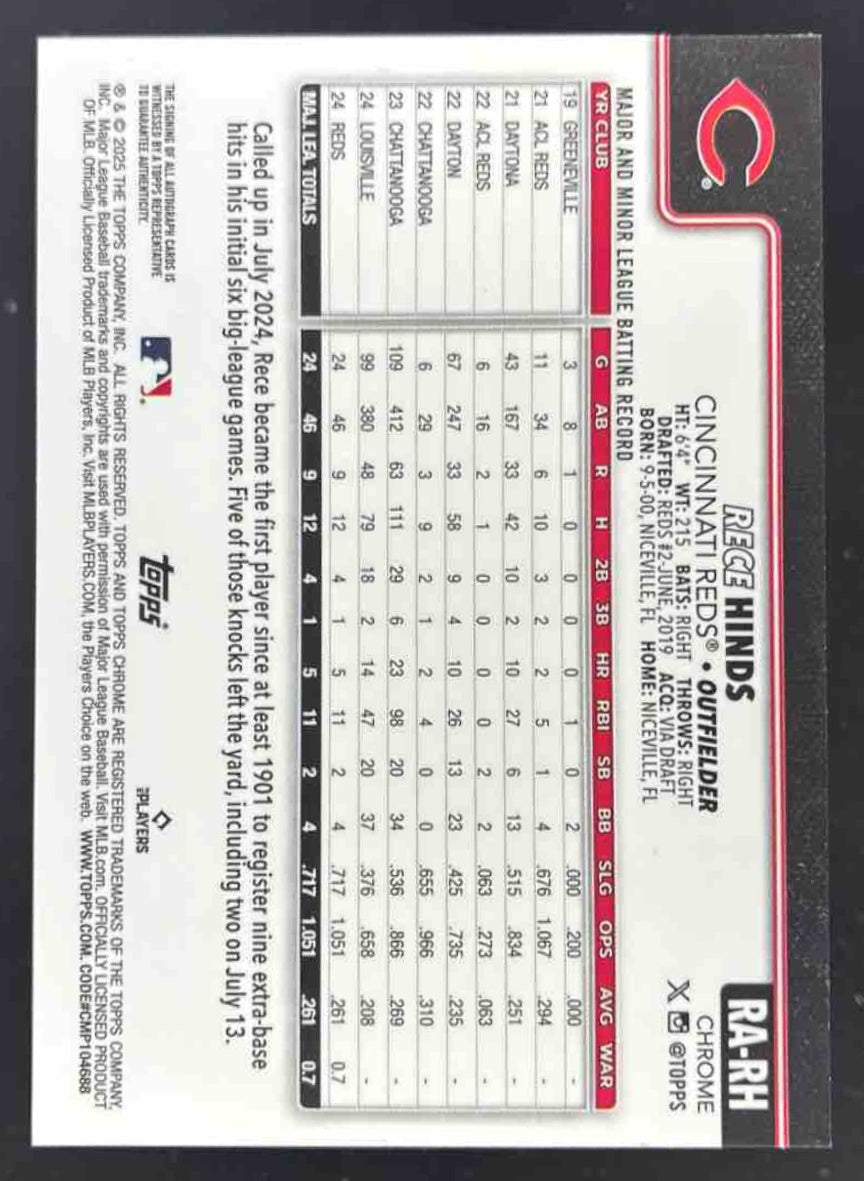 2025 Topps Chrome Rookie Autographs Gold Refractor #RA-RH Rece Hinds RC Auto /50