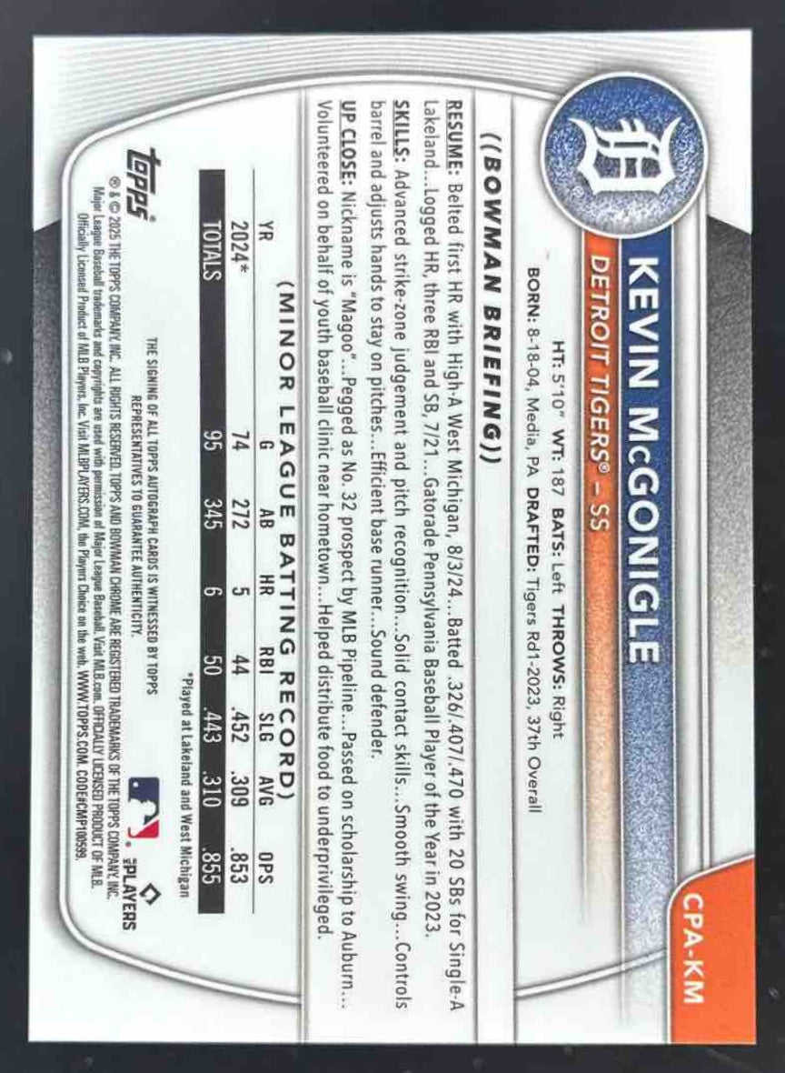 2025 Bowman Chrome Autographs #CPA-KM Kevin McGonigle RC Auto