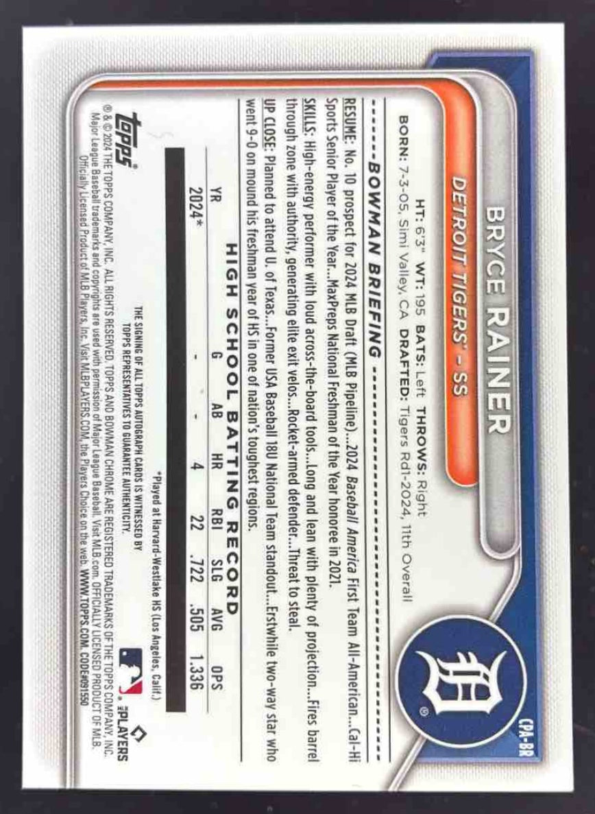 2024 Bowman Draft Chrome Autographs #CPA-BR Bryce Rainer RC Auto