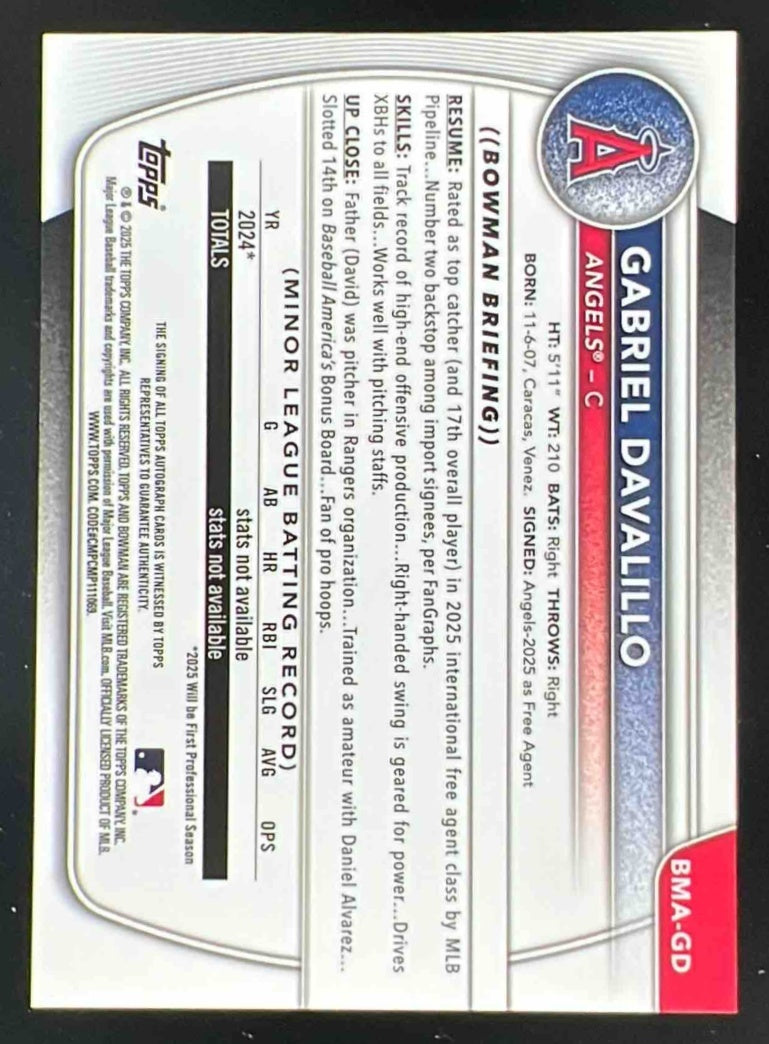2025 Bowman Chrome Mega Box Blue Refractor #BMAGD Gabriel Davalillo RC Auto /150