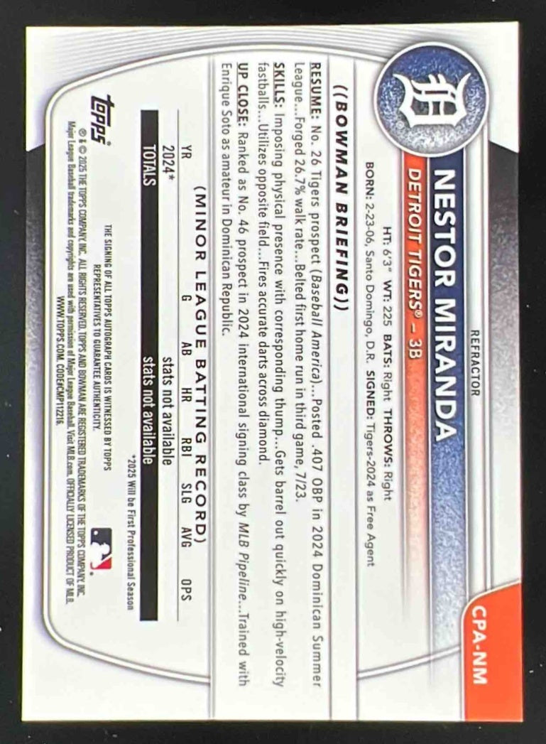 2025 Bowman Chrome Autograph Refractor #CPA-NM Nestor Miranda RC Auto /499