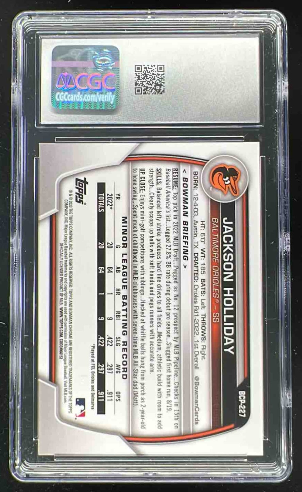 2023 Bowman Chrome Sapphire Prospects Yellow #BCP227 Jackson Holliday /50 CGC 10