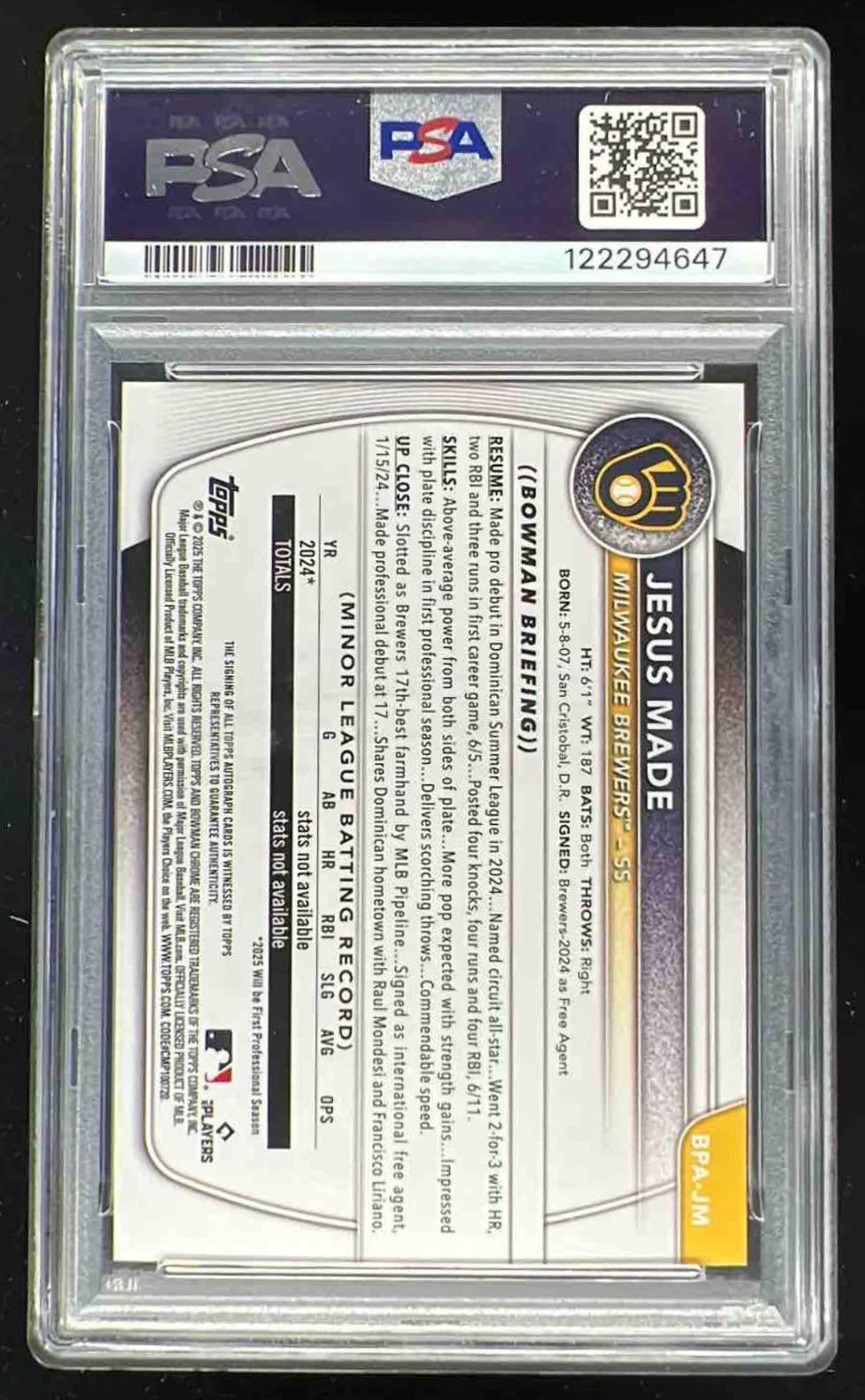 2025 Bowman Autographs Blue Border #BPA-JM Jesus Made RC Auto /150 PSA 8