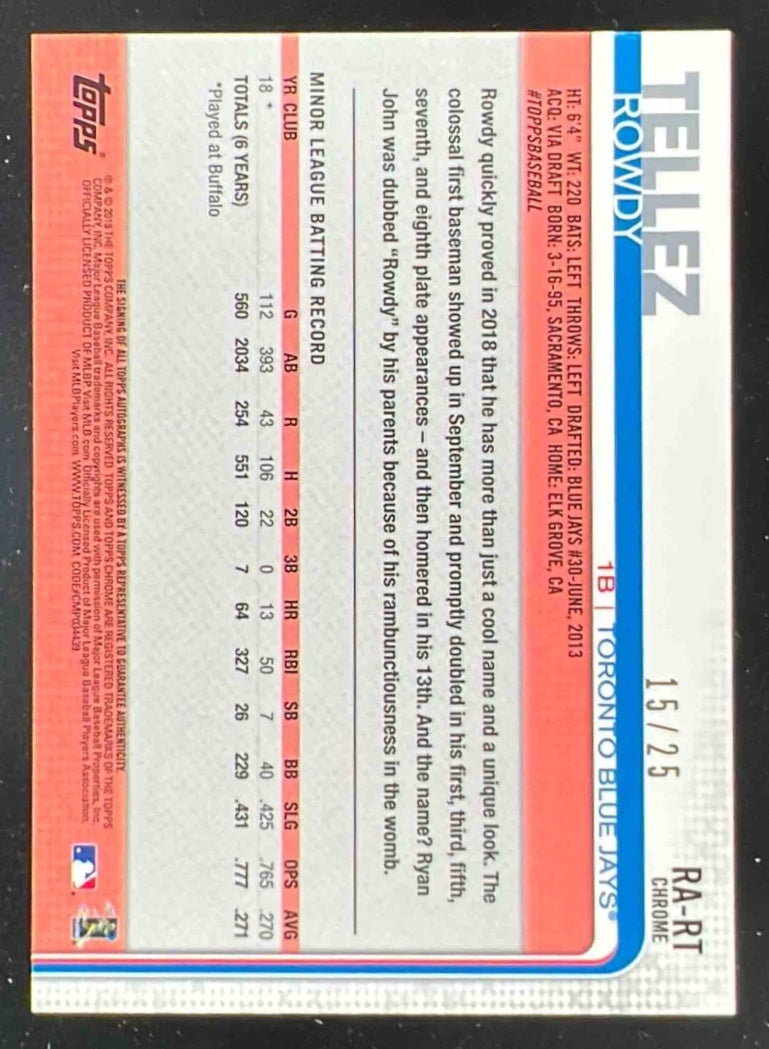 2019 Topps Chrome Rookie Orange Wave Refractor #RA-RT Rowdy Tellez RC Auto /25