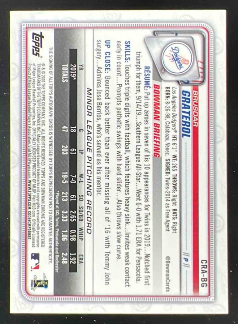 2020 Bowman Chrome Rookie Gold Refractor #CRA-BG Brusdar Graterol RC Auto /50