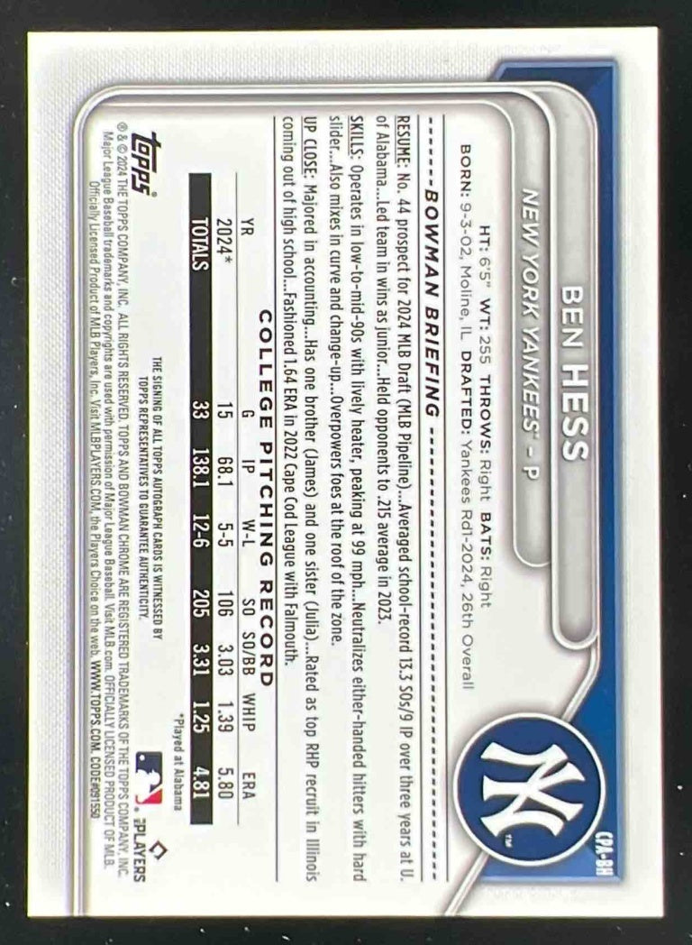 2024 Bowman Draft Chrome Autographs #CPA-BH Ben Hess RC Auto