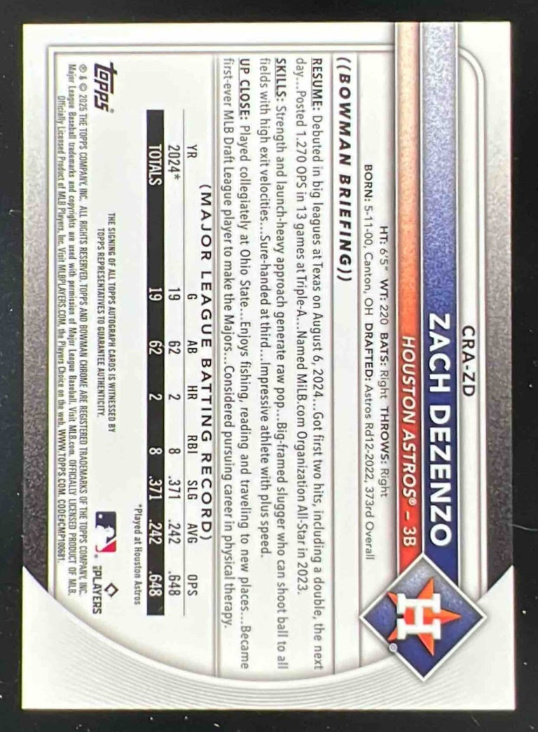 2025 Bowman Chrome Rookie Blue Refractor #CRA-ZD Zach Dezenzo RC Auto /150