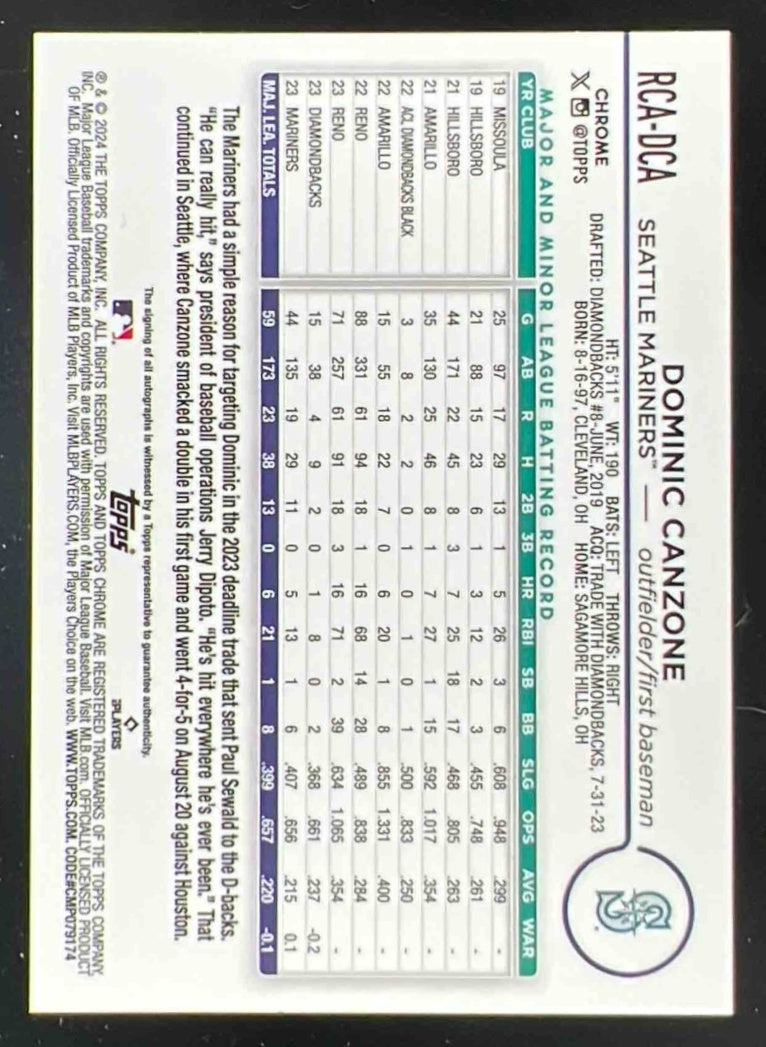 2024 Topps Chrome Logofractor MLB Refractor #RCA-DCA Dominic Canzone RC Auto
