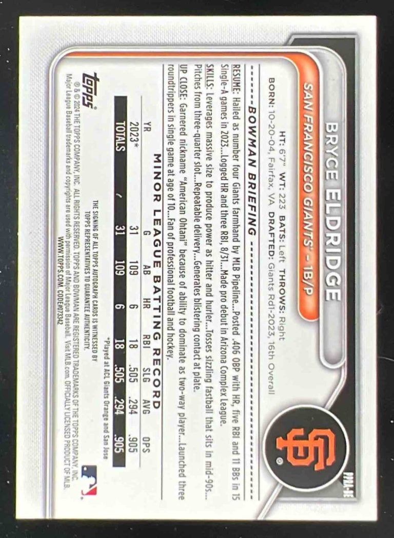 2024 Bowman Prospect Autographs Purple #PPRA-BE Bryce Eldridge Auto /250