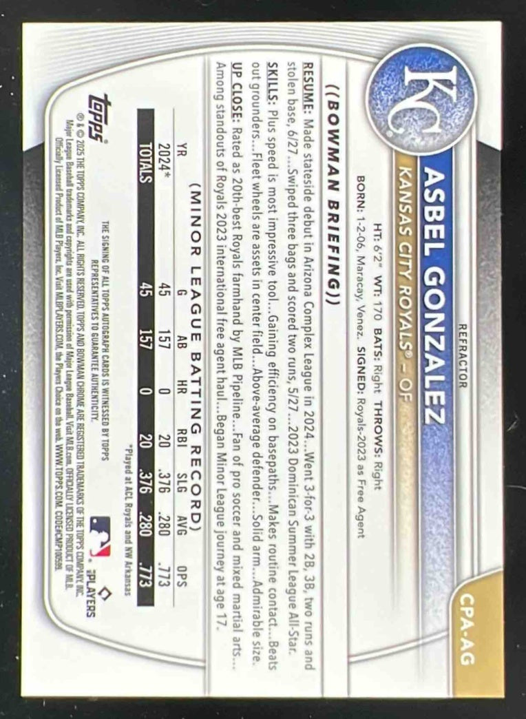 2025 Bowman Chrome Autograph Refractor #CPA-AG Asbel Gonzalez Auto /499