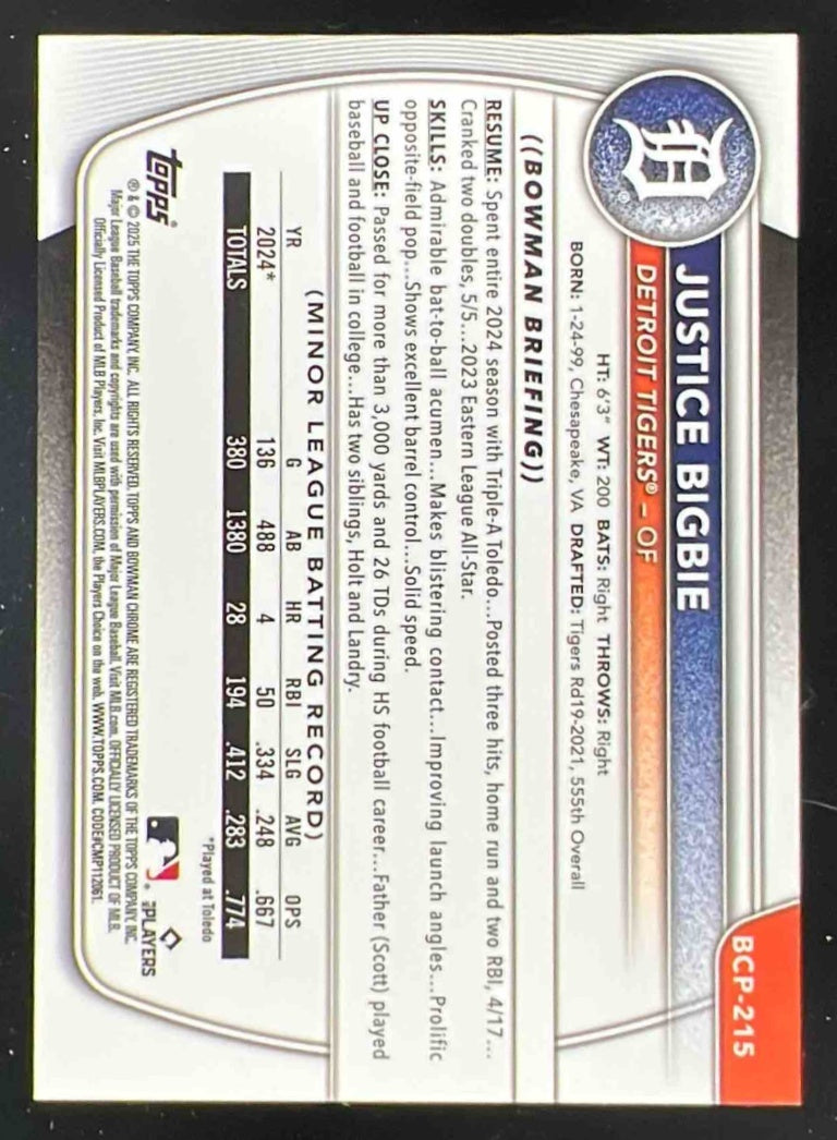 2025 Bowman Chrome Sapphire Orange Refractor #BCP-215 Justice Bigbie RC /25