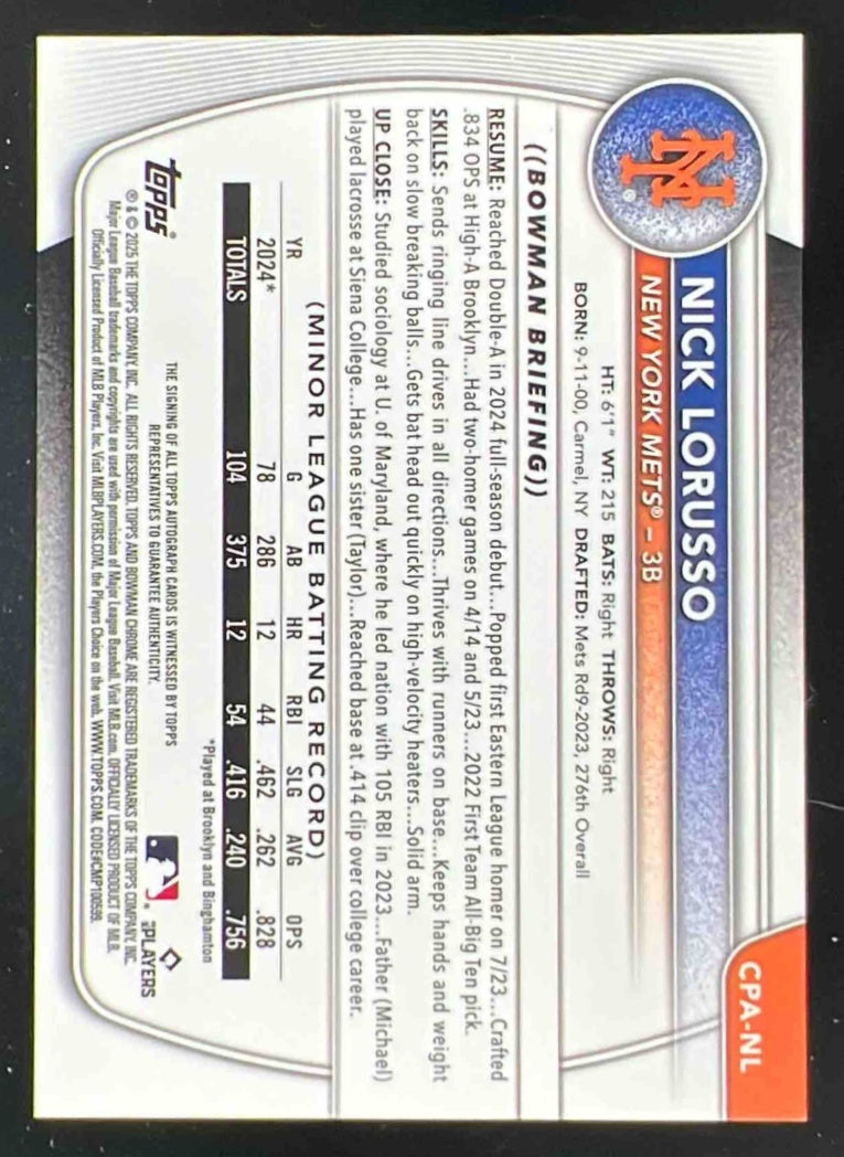 2025 Bowman Chrome Autograph Green Refractor #CPA-NL Nick Lorusso RC Auto /99
