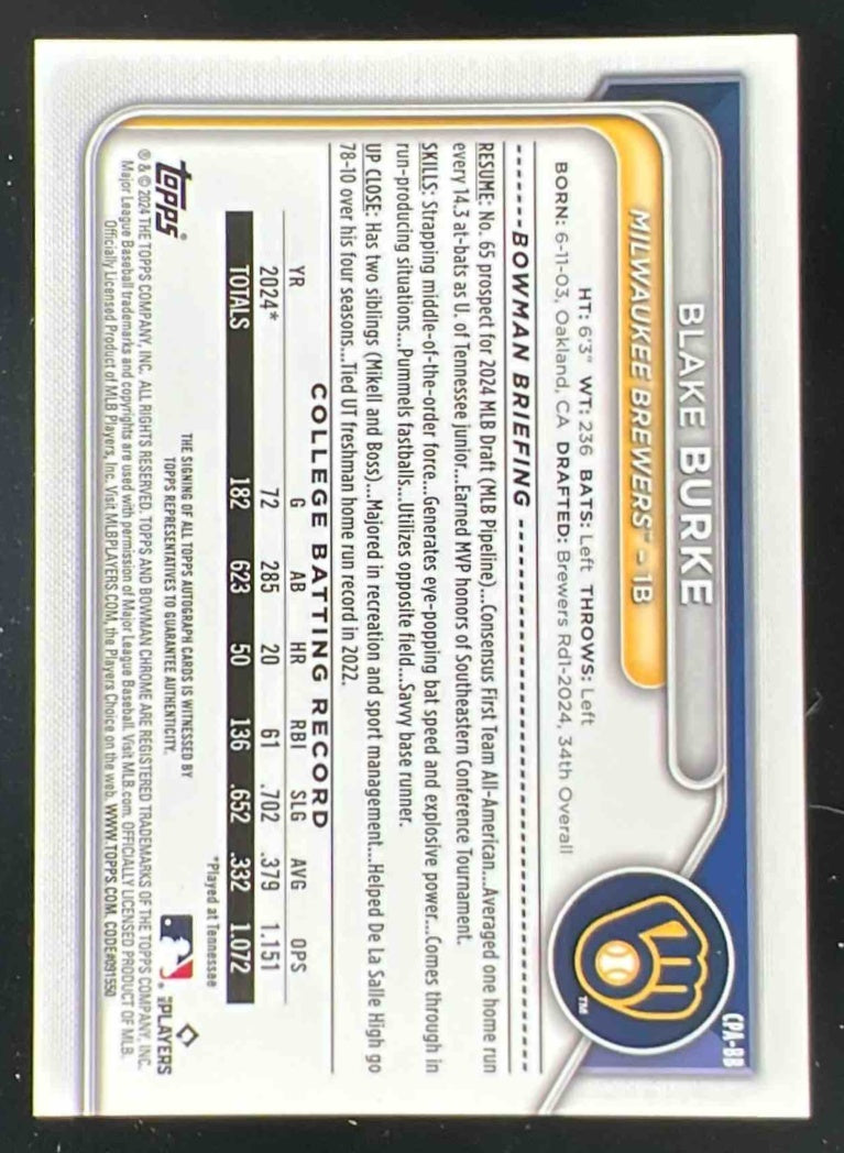 2024 Bowman Draft Chrome Autographs Green Refractor #BB Blake Burke RC Auto /99