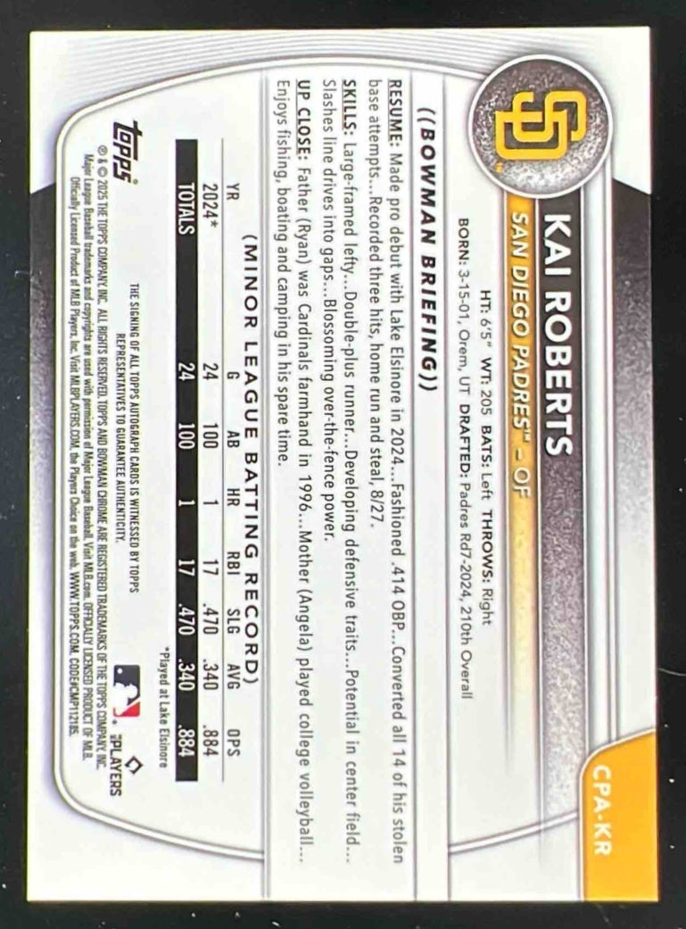 2025 Bowman Chrome Autograph Gold Refractor #CPA-KR Kai Roberts RC Auto /50