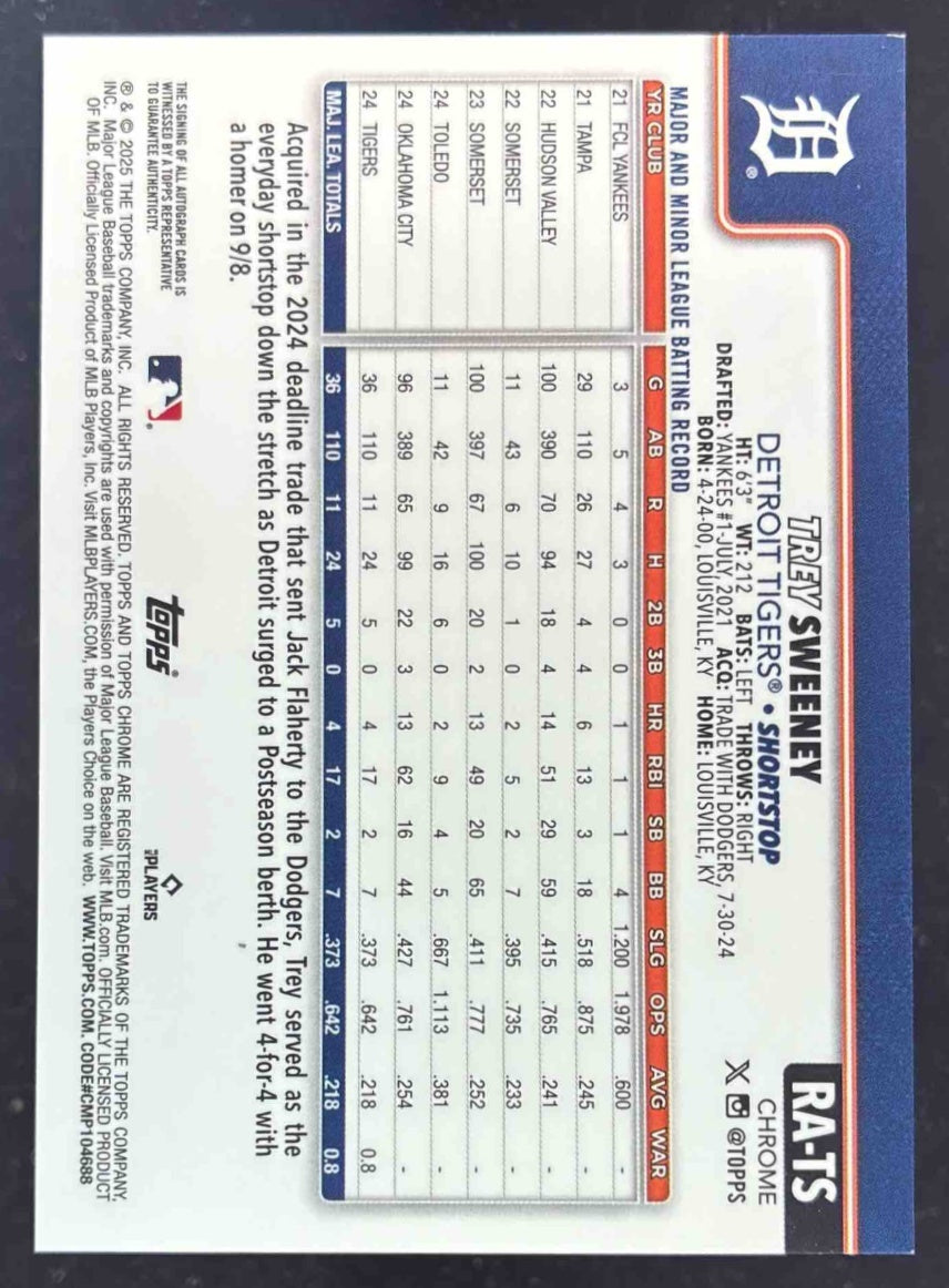 2025 Topps Chrome Rookie Purple Speckle Refractor #TS Trey Sweeney RC Auto /299
