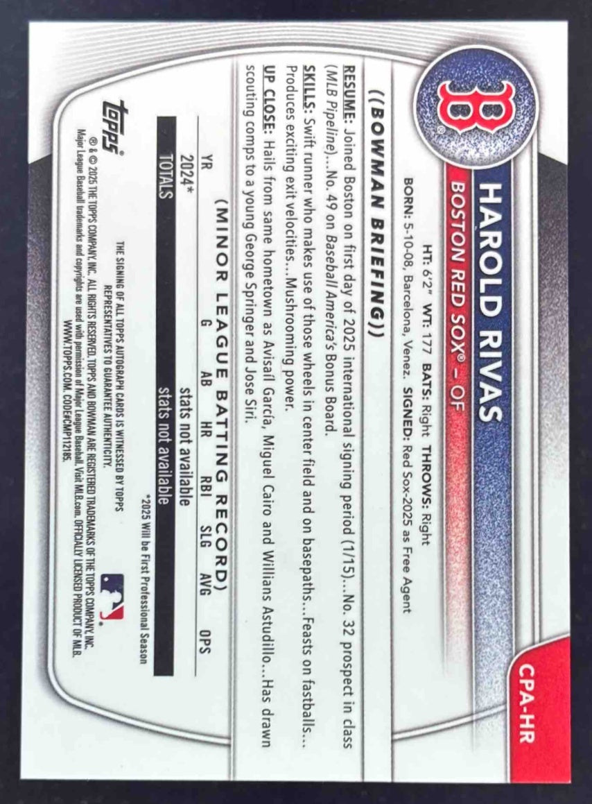 2025 Bowman Chrome Chrome Speckle Refractor #CPA-HR Harold Rivas RC Auto /299