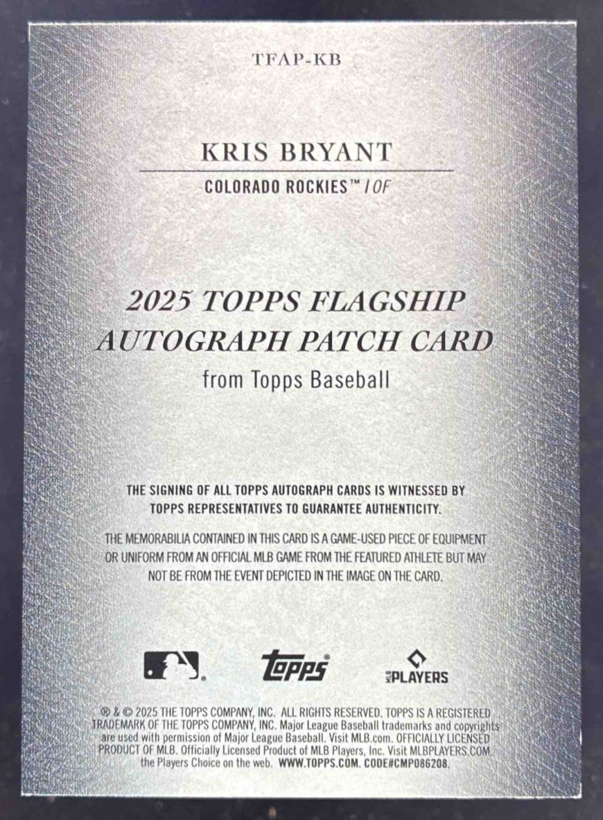 2025 Topps Topps Autograph Patch #TFAP-KB Kris Bryant Auto /30