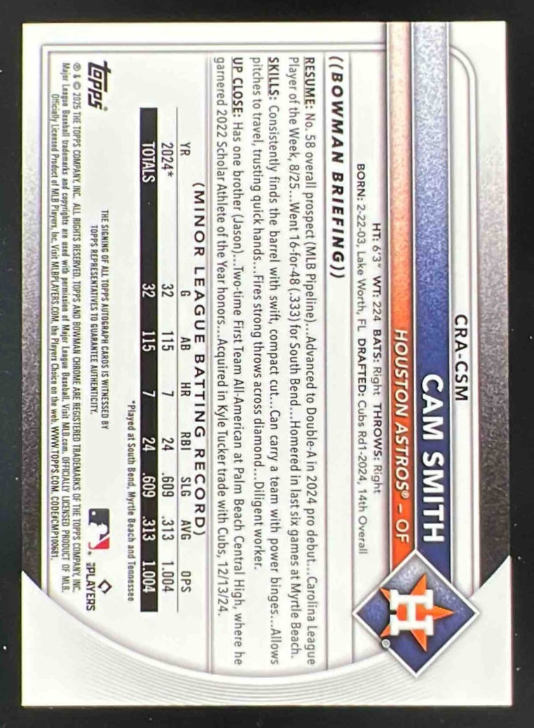 2025 Bowman Chrome Rookie Autograph Blue #CRA-CSM Cam Smith RC Auto /150