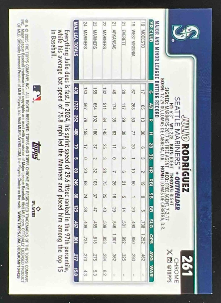 2025 Topps Chrome Gold RayWave Refractor #261 Julio Rodriguez /50