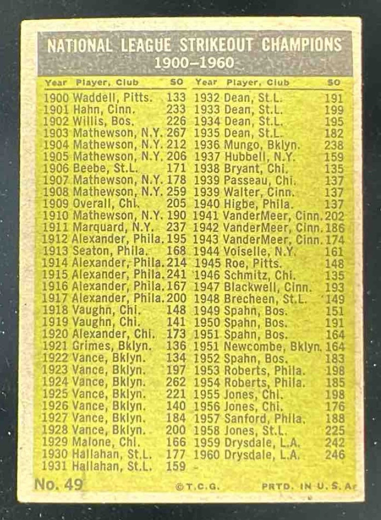 1961 Topps #49 Don Drysdale Sandy Koufax Sam Jones Ernie Broglio