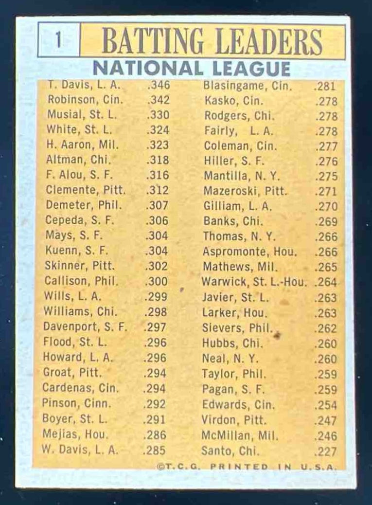 1963 Topps #1 Tommy Davis Frank Robinson Stan Musial Bill White Hank Aaron