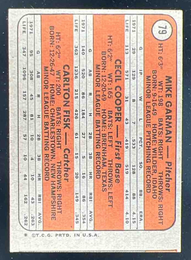1972 Topps #79 Mike Garman Cecil Cooper Carlton Fisk RC