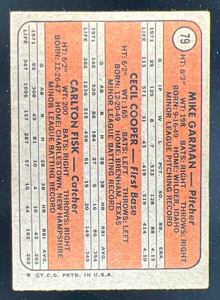 1972 Topps #79 Mike Garman Cecil Cooper Carlton Fisk RC