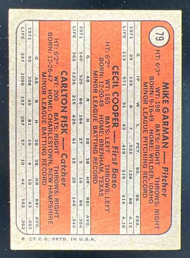 1972 Topps #79 Mike Garman Cecil Cooper Carlton Fisk RC