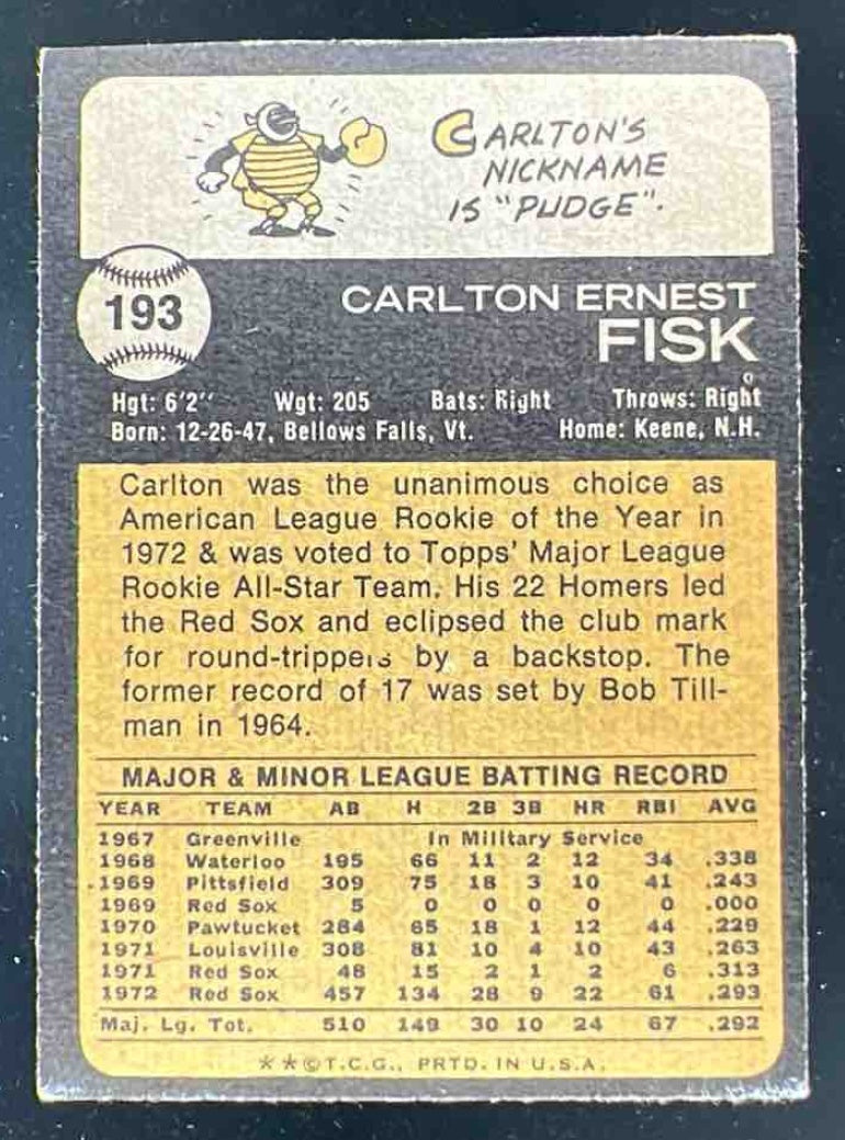 1973 Topps #193 Carlton Fisk Super Rookie All-Star