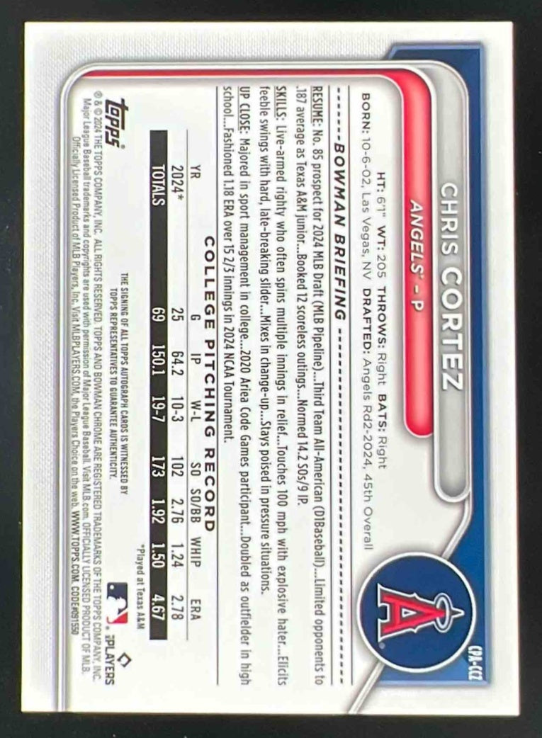 2024 Bowman Draft Chrome Autographs Gold Refractor Chris Cortez RC Auto /50