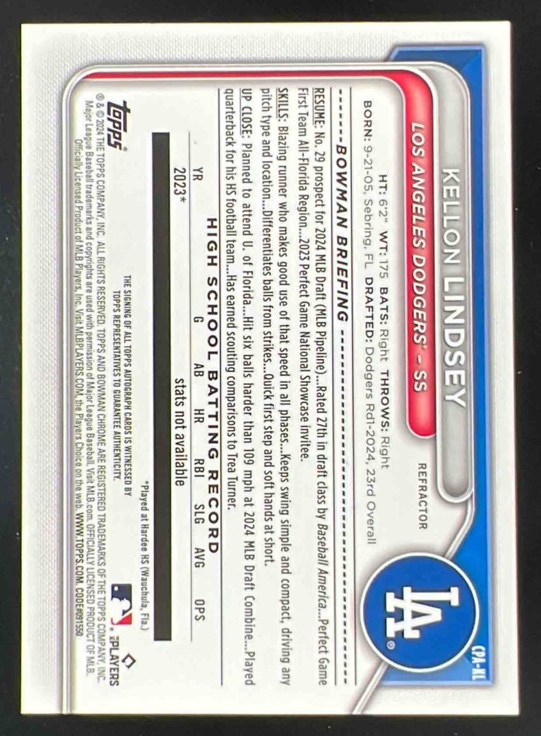 2024 Bowman Draft Chrome Autograph Refractor #CPA-KL Kellon Lindsey RC Auto /499