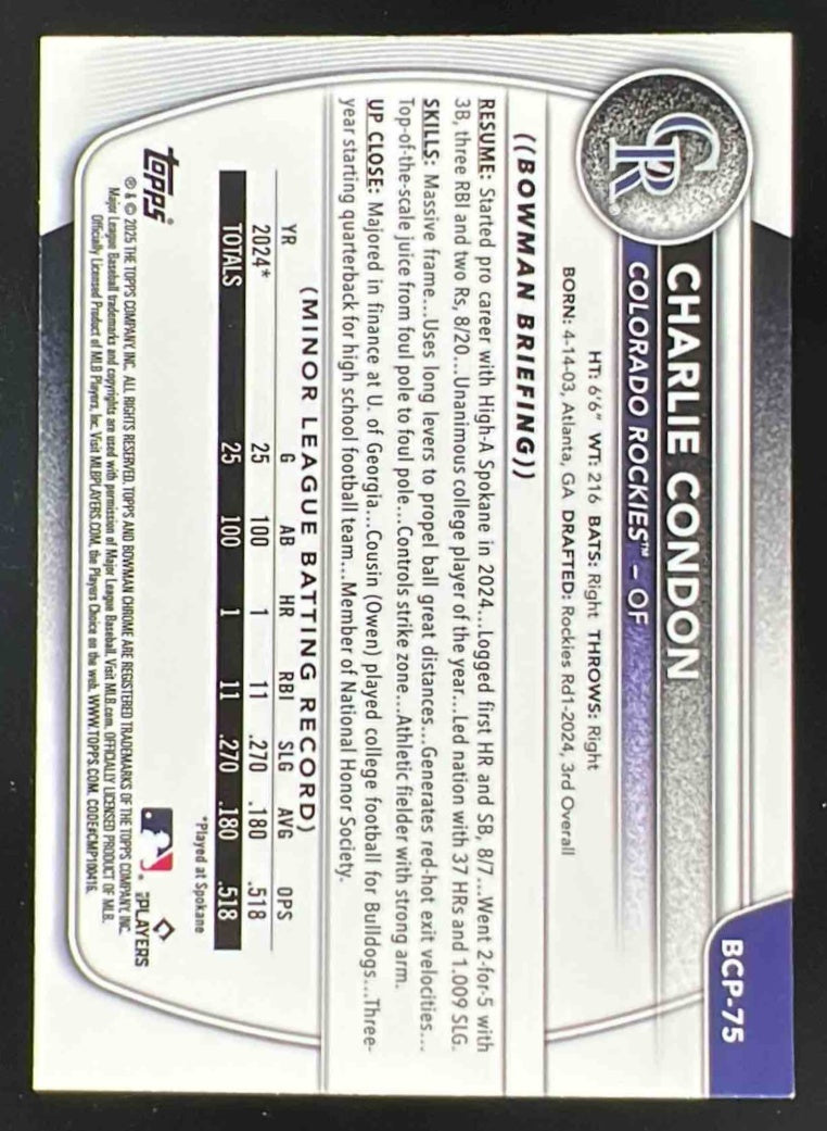 2025 Bowman Chrome Prospects Yellow X-Fractor #BCP-75 Charlie Condon RC /75