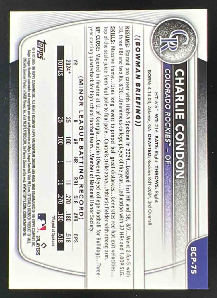 2025 Bowman Chrome Prospects Gold Geometric #BCP-75 Charlie Condon RC /50