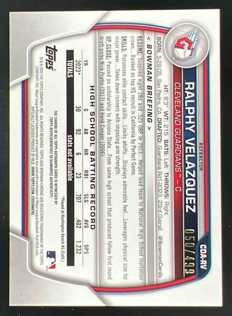 2023 Bowman Chrome Autographs Refractor #CDA-RV Ralphy Velazquez RC Auto /499