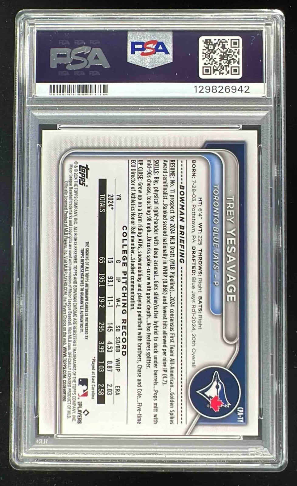 2024 Bowman Draft Chrome Autographs #CPA-TY Trey Yesavage RC Auto PSA 10