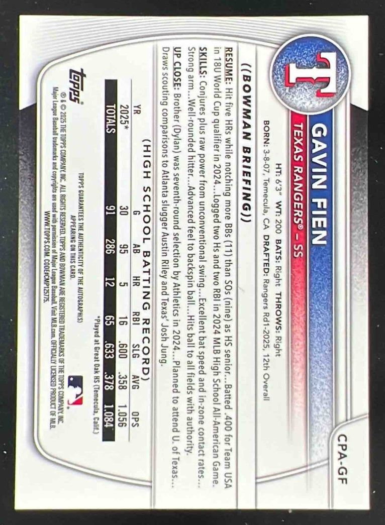 2025 Bowman Draft Chrome Orange Refractor #CPA-GF Gavin Fien RC Auto /25