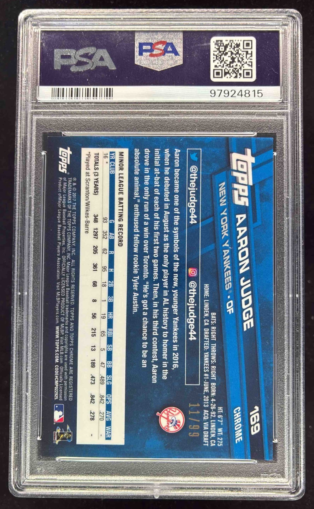 2017 Topps Chrome Green Refractor #169 Aaron Judge RC /99 PSA 9