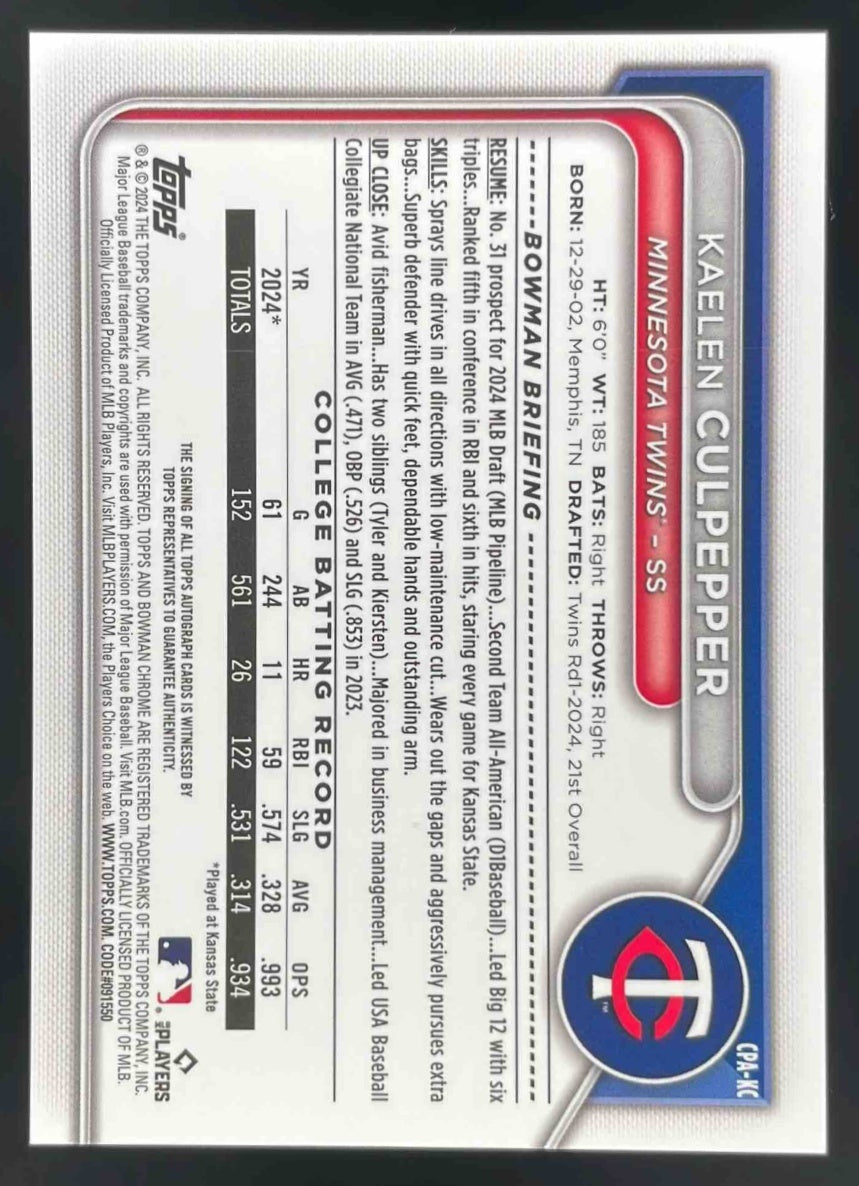 2024 Bowman Draft Chrome Prospect Autographs #CPA-KC Kaelen Culpepper RC Auto