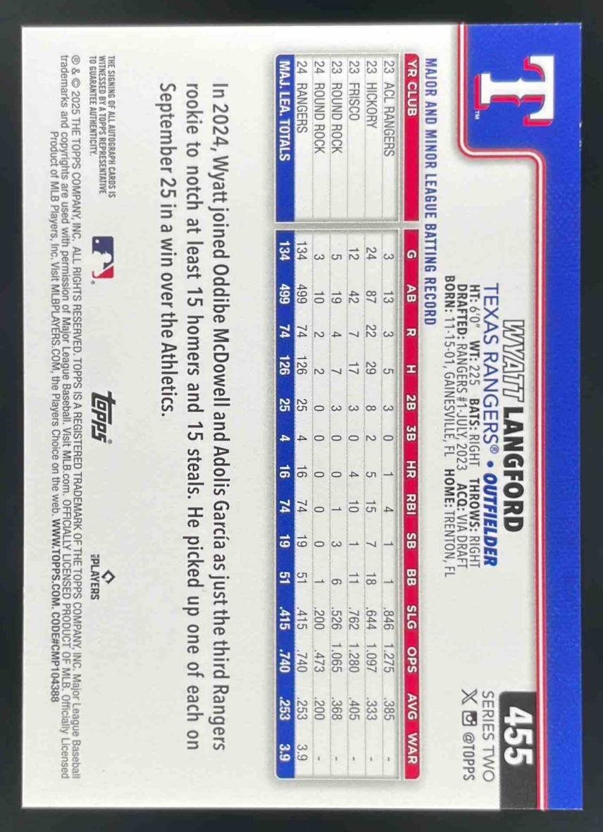 2025 Topps Real One Autographs Series 2 #455 Wyatt Langford Auto