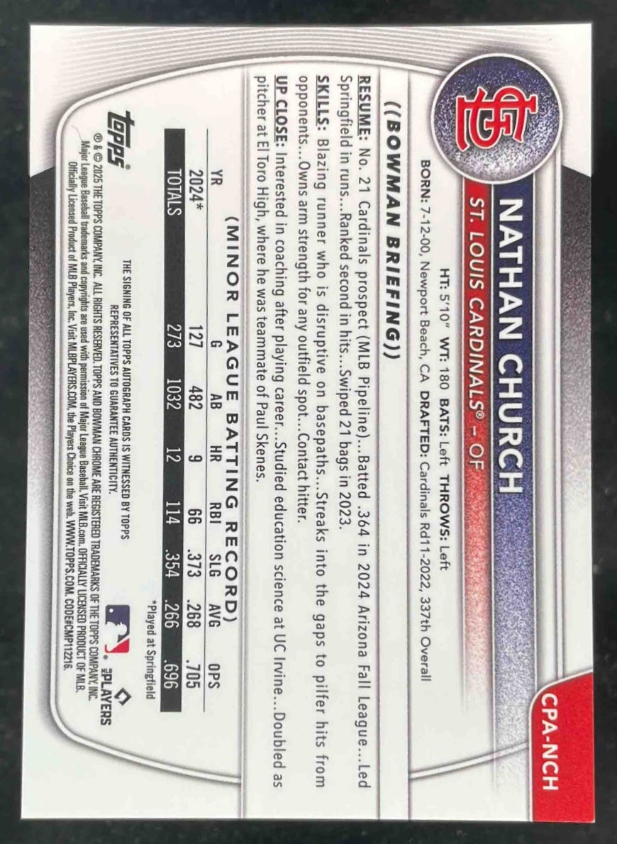 2025 Bowman Chrome Autograph Gold Refractor #CPA-NCH Nathan Church RC Auto /50