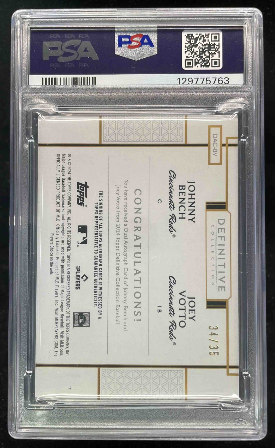 2024 Topps Definitive Collection Dual Auto Joey Votto Johnny Bench /35 PSA 10