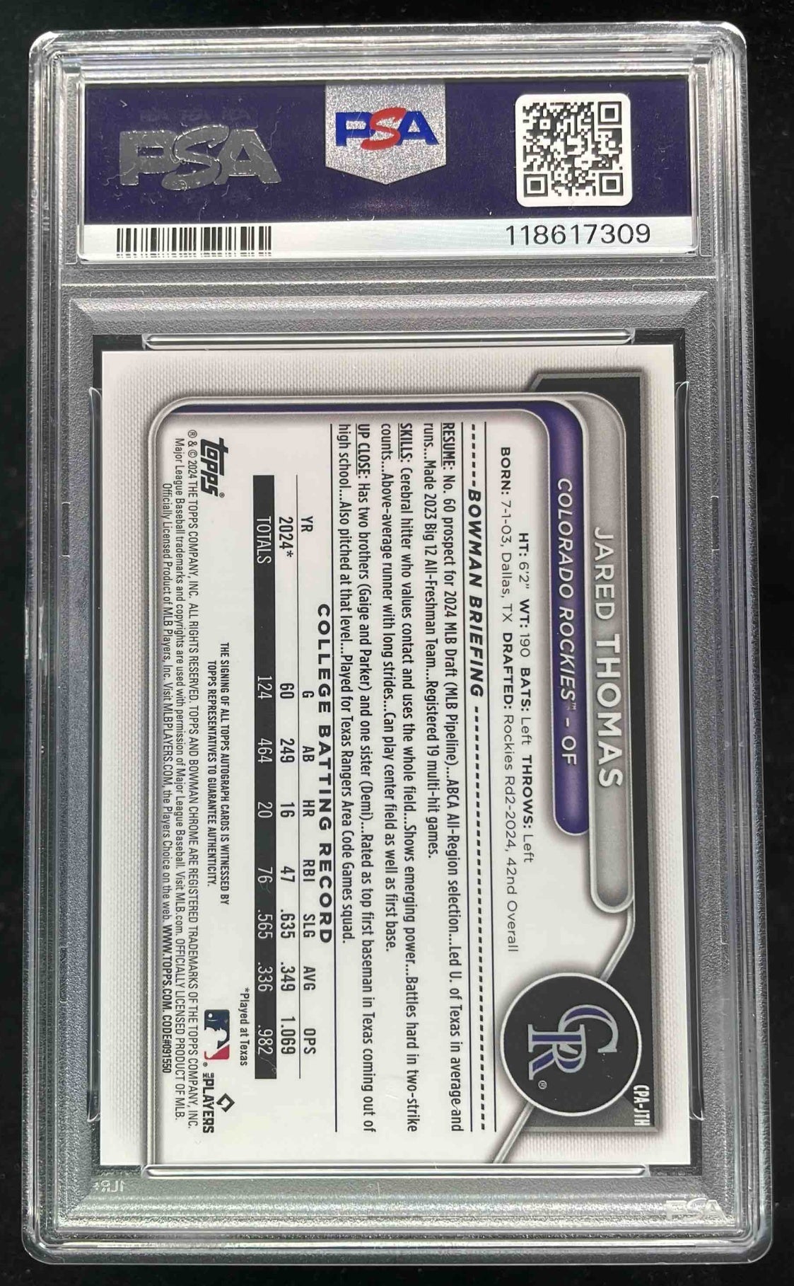 2024 Bowman Draft Sapphire Chrome #CPA-JTH Jared Thomas RC Auto /199 PSA 10