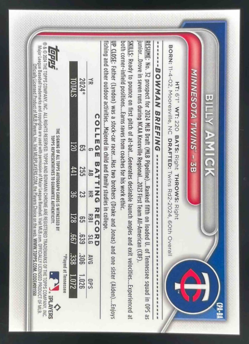 2024 Bowman Draft Chrome Prospect Autographs #CPA-BA Billy Amick RC Auto