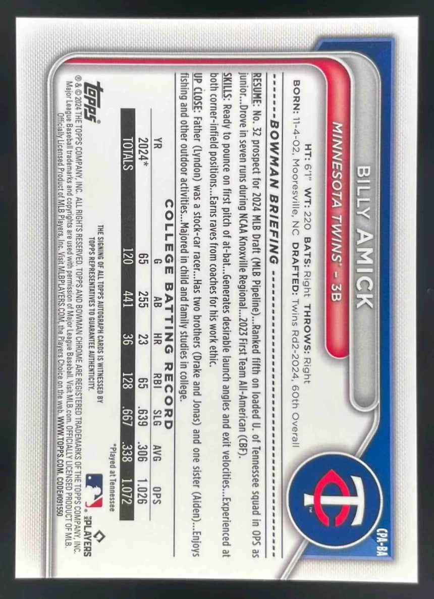 2024 Bowman Draft Chrome Prospect Autographs #CPA-BA Billy Amick RC Auto