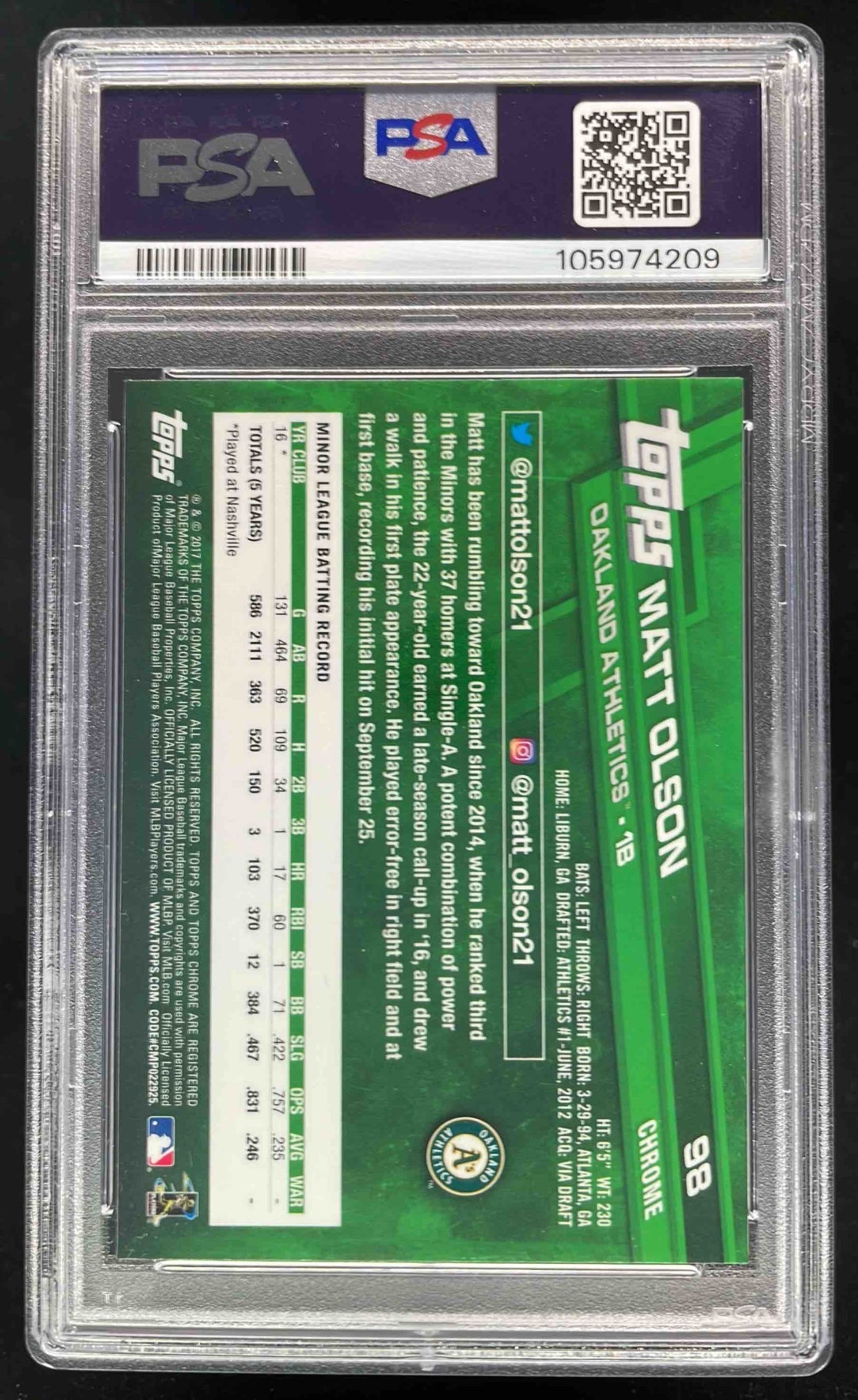 2017 Topps Chrome #98 Matt Olson RC PSA 10