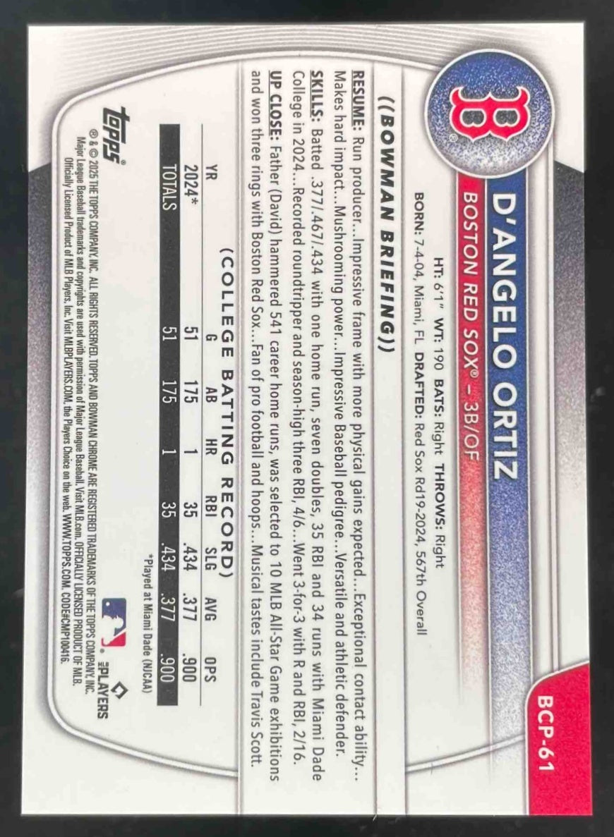 2025 Bowman Sapphire Chrome Gold Refractors #BCP-61 D'Angelo Ortiz RC /50