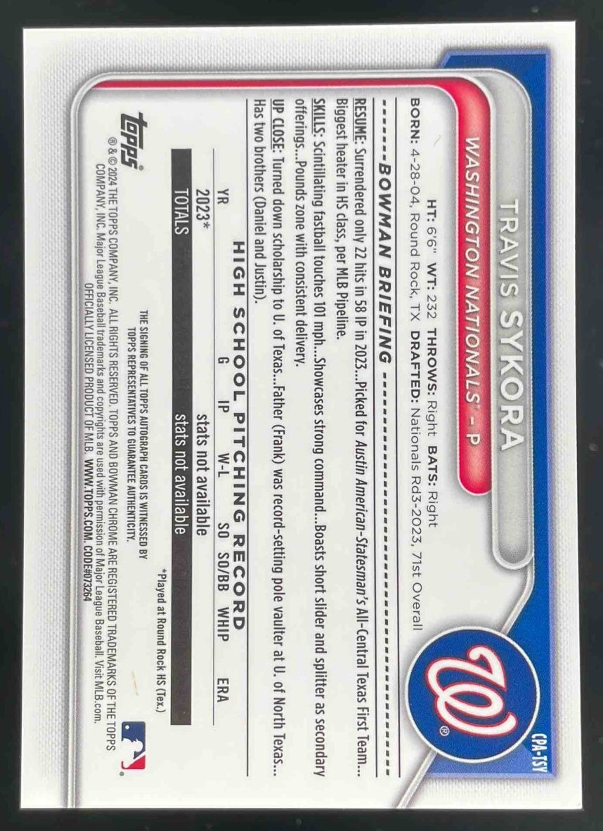 2024 Bowman Chrome Mini Diamond Refractor #CPA-TSY Travis Sykora RC Auto /100